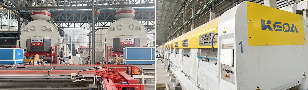 該整線項(xiàng)目包含科達(dá)原料整廠設(shè)備,2臺(tái)KD8518壓機(jī)、五層干燥器、施釉線、高效節(jié)能寬體窯以及數(shù)控智能拋光線、智能儲(chǔ)運(yùn)系統(tǒng)、大板快速包裝線等窯后智能整線設(shè)備,可生產(chǎn)600×600(mm)、800×800(mm)常規(guī)規(guī)格拋釉磚以及750×1500(mm)、800×1600(mm)等規(guī)格的高品質(zhì)大板產(chǎn)品,助力鉑金企業(yè)進(jìn)一步鞏固其市場競爭力。