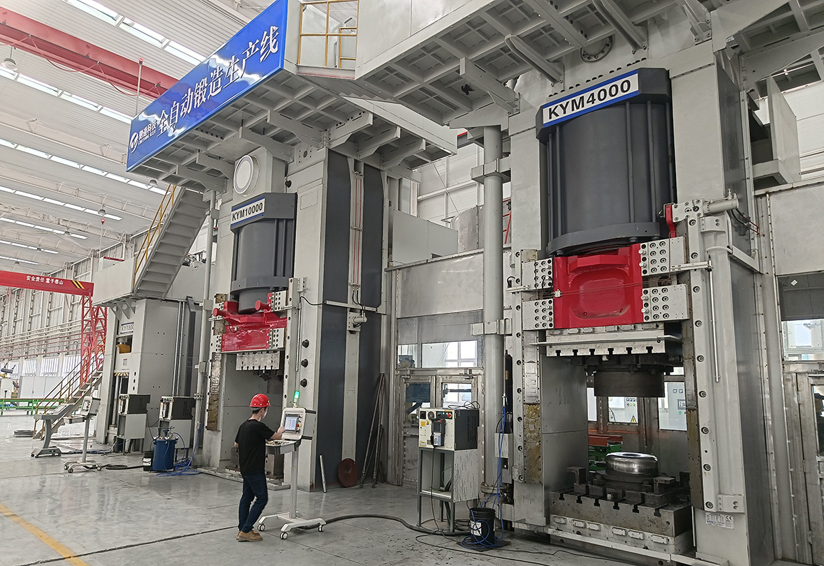 該條全自動(dòng)鍛造生產(chǎn)線引入了3臺(tái)科達(dá)壓機(jī),分別為預(yù)鍛部分的KYM4000鍛造壓機(jī)、成型鍛KYM10000鍛造壓機(jī)以及沖擴(kuò)孔KYM800噸壓機(jī)。