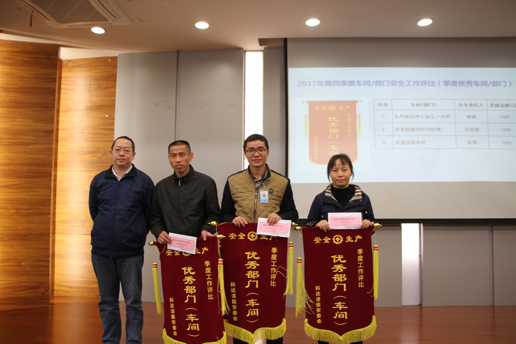 2017年第四季度安全生產(chǎn)優(yōu)秀部門(車間):生產(chǎn)供應(yīng)中心金工一車間、研發(fā)院數(shù)碼打印機(jī)械裝配車間、成型壓機(jī)車間(獎(jiǎng)金:1000/單位),生產(chǎn)供應(yīng)中心總經(jīng)理毛清為獲獎(jiǎng)單位頒獎(jiǎng)。