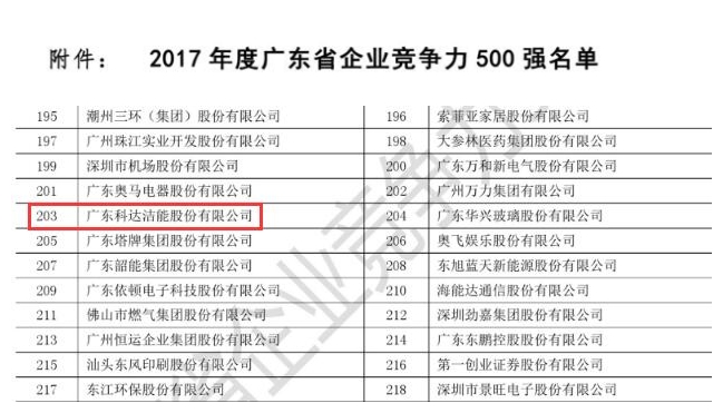 科達潔能榮登“廣東省企業(yè)競爭力500強”榜單