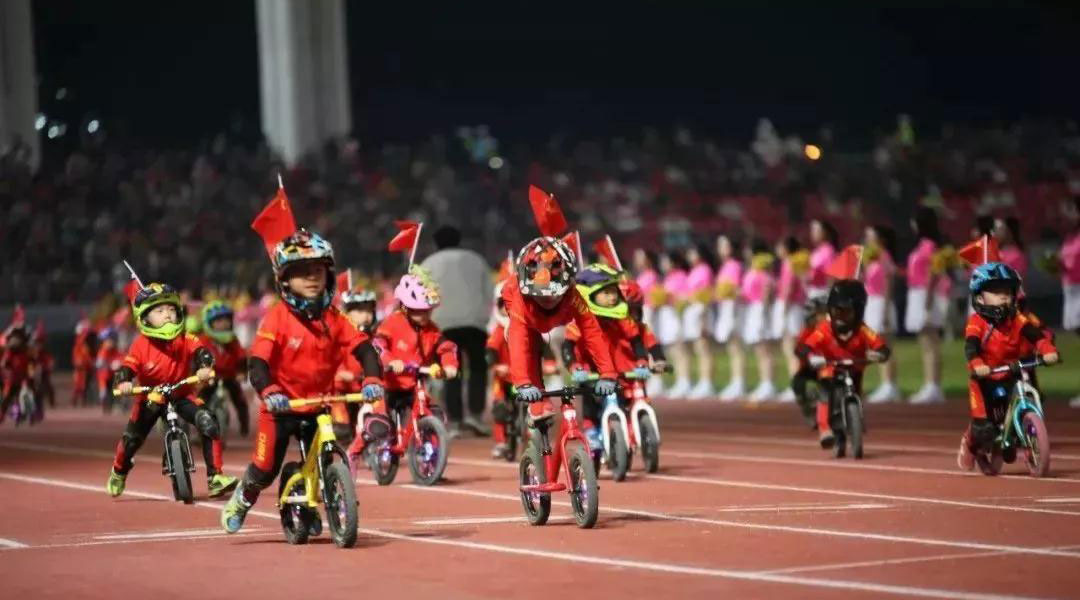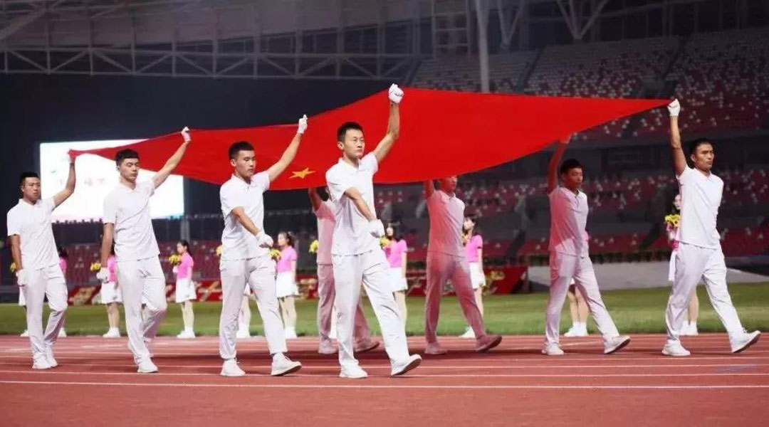 當(dāng)晚19時(shí)45分,歡快的樂聲響起,開幕式暖場表演正式開始。身著大紅色的喜慶服裝,由近百人組成的馬鞍山非遺表演《打蓮湘》隊(duì)伍一下就帶動(dòng)了全場的氣氛。暖場表演結(jié)束后,伴隨著《歌唱祖國》、《擁抱新時(shí)代》的背景音樂,鮮艷的五星紅旗和十二運(yùn)會(huì)會(huì)旗率先入場。緊隨其后的,是朝氣蓬勃的紅旗方隊(duì),120名青年手持紅旗,大步流星、氣宇軒昂。100名萌寶組成的滑步車方隊(duì)活力滿滿,向未來出發(fā),向希望前行。