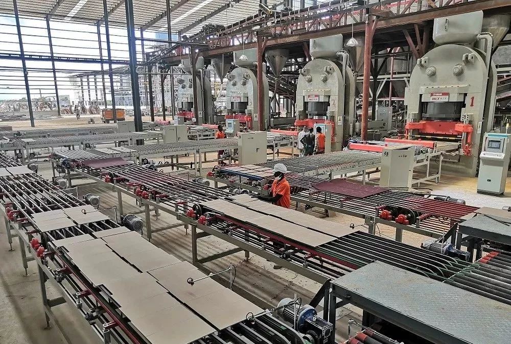 2019年下半年,恒力泰近20臺YP系列自動液壓機在旺康集團相繼投產(chǎn)。其中,沙特旺康8臺YP3609,主要生產(chǎn)600×600(mm)拋釉磚和水晶磚,總?cè)债a(chǎn)量可達十萬平方米;加納旺康4臺YP4000B,主要壓制600×600(mm)拋釉磚,總?cè)债a(chǎn)量超兩萬平方米;尼日利亞旺康4臺YP4000B;主要壓制250×400(mm)內(nèi)墻磚,總?cè)债a(chǎn)量超五萬平方米。