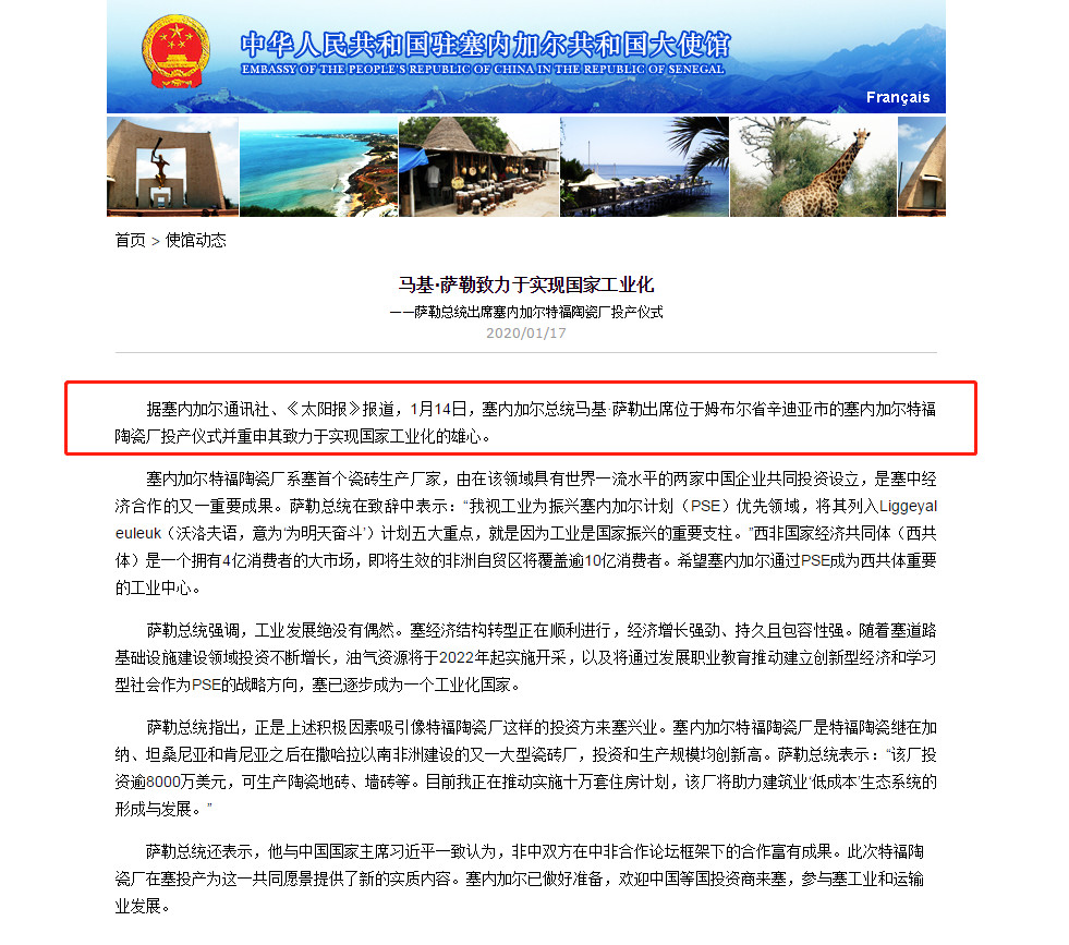 2020年1月15日,塞內(nèi)加爾特福陶瓷廠有限公司(以下簡稱“塞內(nèi)特福陶瓷廠”)在辛賈舉行總統(tǒng)參觀剪彩儀式。塞內(nèi)加爾總統(tǒng)馬基?薩勒、中國駐塞內(nèi)加爾大使張迅、塞內(nèi)加爾工業(yè)部長穆斯塔法?迪奧普、礦業(yè)部長索菲?格拉迪馬、交通和基礎(chǔ)建設(shè)部長奧馬爾?尤姆、總統(tǒng)府多位部長、聯(lián)合國工發(fā)組織與世界銀行代表,以及其他政府官員、地方宗教領(lǐng)袖、合作伙伴和部分駐塞中資企業(yè)代表等數(shù)百嘉賓隆重出席。塞內(nèi)加爾國家電視臺、當(dāng)?shù)刈畲髨蠹垺短枅蟆芬约叭麅?nèi)加爾各網(wǎng)絡(luò)報紙媒體、中國中央電視臺英文頻道、《中國經(jīng)濟(jì)日報》與中國國際廣播電臺等媒體對該活動進(jìn)行了報道。
