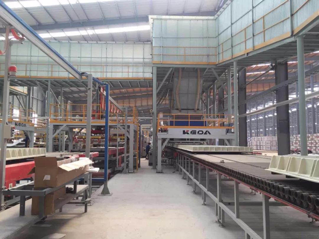 高度自動化,低人工成本。寶豐圣諾一期發(fā)泡陶瓷隔墻保溫板工程是科達提供的整廠工程, 包含原料制備設備、粉料輸送設備、裝卸圍板機械手、自動布料機、輥道窯、AGV自動回板線和自動刮平切割線等。除鋪紙工序外,其他工序均自動化操作,大大減少工人數(shù)量,降低對工人的技術(shù)水平要求。