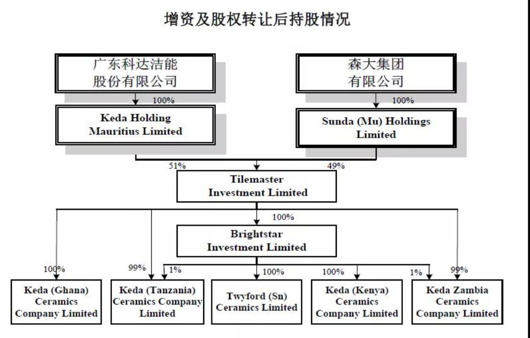公告還指出,為優(yōu)化集團管理體系,科達潔能及森大集團擬調(diào)整非洲合資公司的股權(quán)架構(gòu),以分別持有的非洲合資公司股權(quán)及債權(quán),對新設(shè)合資公司 Tilemaster 進行增資及相關(guān)股權(quán)轉(zhuǎn)讓。本次股權(quán)變更完成后,科達潔能及森大集團對非洲合資公司持有的股權(quán)比例保持不變,其中,科達潔能通過全資子公司 Keda Holding 持有Tilemaster 51%股權(quán),從而間接持有各合資公司 51%股權(quán)。