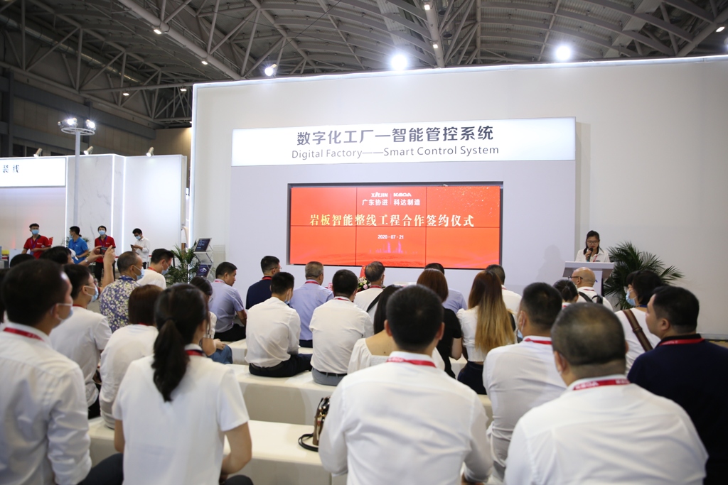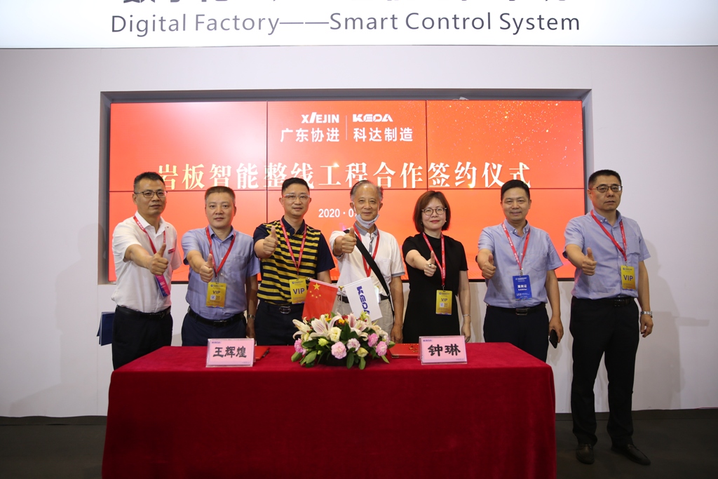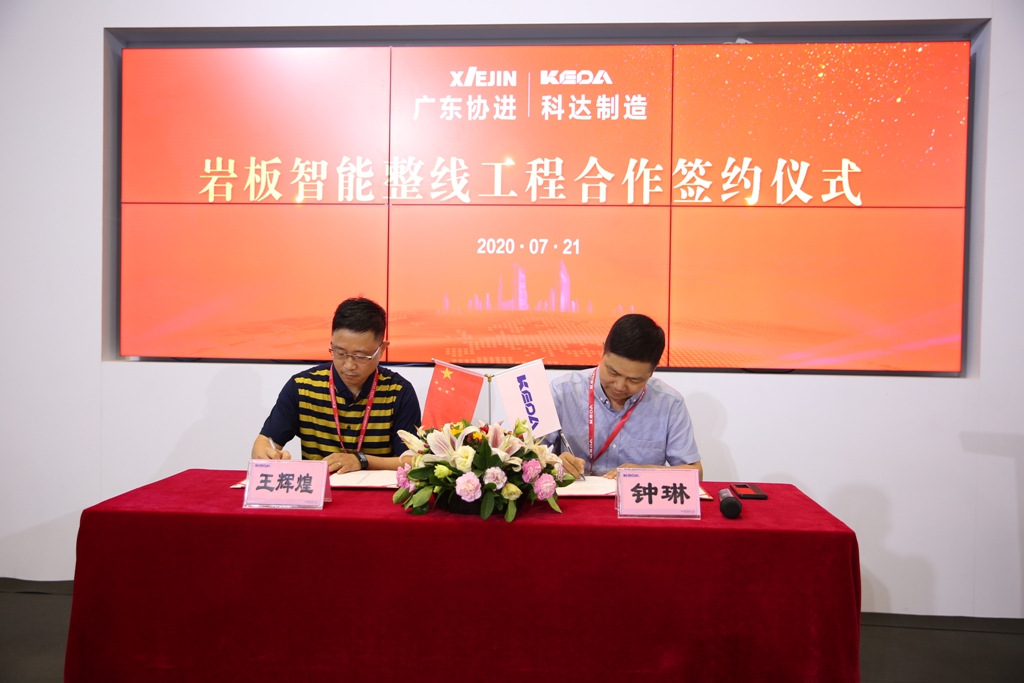 7月21日,科達展位智能管控展示區(qū),在眾多與會觀眾的見證下,廣東協(xié)進陶瓷有限公司與科達制造股份有限公司舉行了“巖板智能整線工程”項目簽約儀式。根據(jù)合約,科達將為廣東協(xié)進提供包括KD16008壓機、巖板窯爐、智能儲磚系統(tǒng),拋光線、包裝線以及智能管控系統(tǒng)在內(nèi)的整線工程。