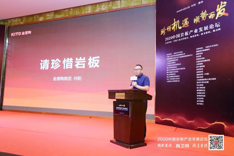 金意陶董事長何乾做了 “請珍惜巖板”的主題演講,他認為,不管是從百度關(guān)鍵詞熱度,還是國內(nèi)的上線速度,巖板已成為現(xiàn)在行業(yè)公認的風口?!皫r板給了行業(yè)很多機會,巖板是消費者對綠色和健康追求的結(jié)果。巖板可替代石材、石英石,在環(huán)保方面有更好的表現(xiàn),巖板和其它材料復合,如發(fā)泡陶瓷,可帶來更廣泛的用途。未來隨著釉線技術(shù)的進步,巖板表面可以呈現(xiàn)更豐富的效果,而得益于坯體工藝技術(shù)和工藝設(shè)備的進步,巖板做薄至2mm甚至1mm都沒問題?!彼瑫r呼吁企業(yè)要珍惜這來之不易的風口,將巖板的品質(zhì)做更好一些,賦予巖板更美好的生命力。