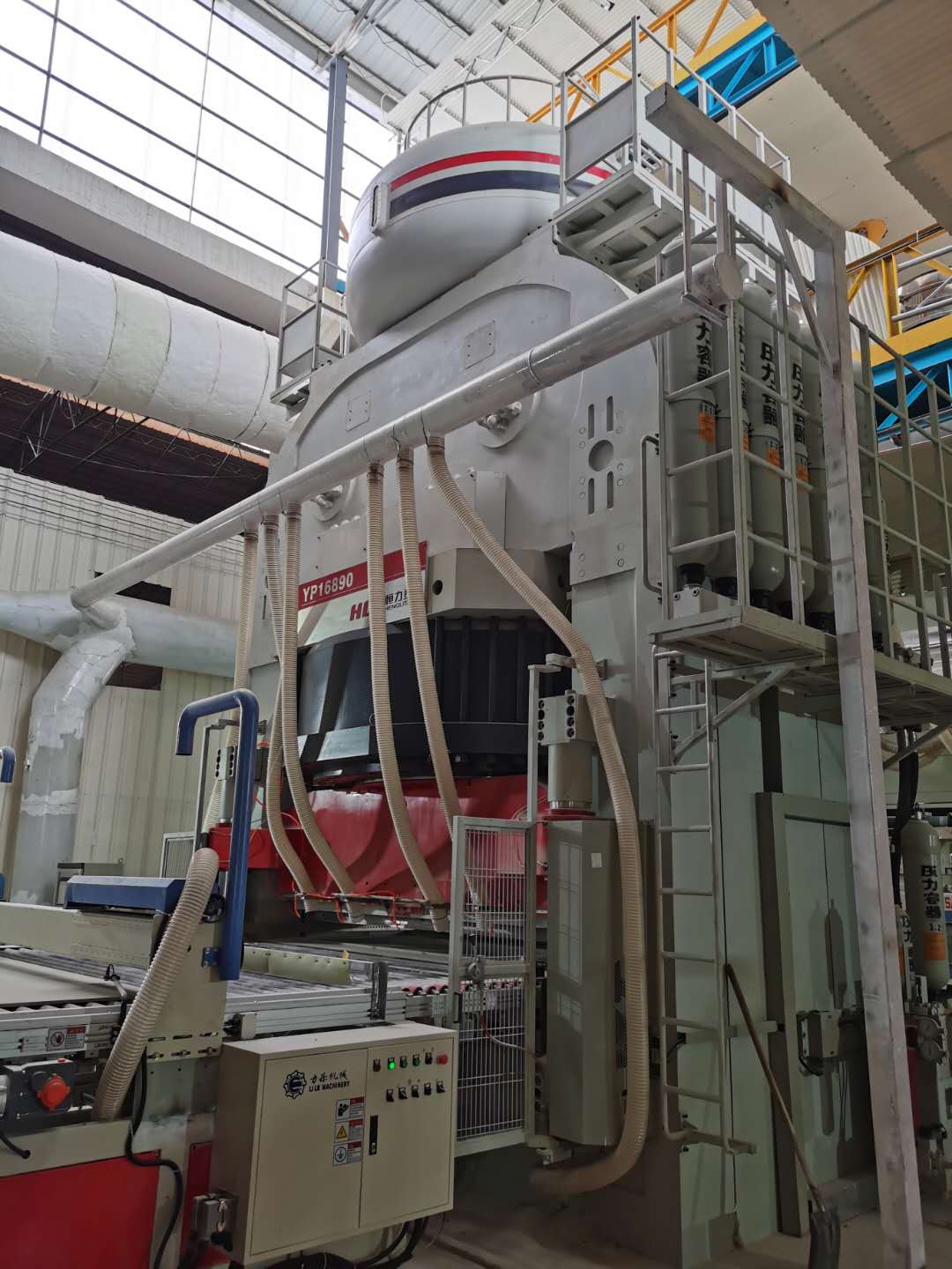 YP16890自動(dòng)液壓機(jī)壓制力為168000kN,可壓制規(guī)格為600×1200(mm)-1200×2700(mm)等,厚度3-30mm的巖板。