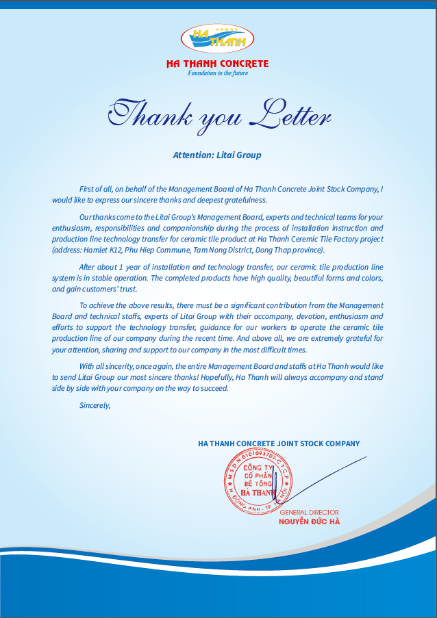 客戶在感謝信中說(shuō)道:"力泰團(tuán)隊(duì)是熱情友好的團(tuán)隊(duì),負(fù)責(zé)任有擔(dān)當(dāng)。非常感謝力泰團(tuán)隊(duì)在河清公司最困難時(shí)期給予的各項(xiàng)幫助與支持。現(xiàn)在生產(chǎn)線整體穩(wěn)定、產(chǎn)品質(zhì)量上乘、造型與色質(zhì)美觀,深受客戶好評(píng)。河清全體職員再次衷心地向力泰團(tuán)隊(duì)表示最誠(chéng)摯的謝意,希望雙方攜手并肩走在成功的大道上。"