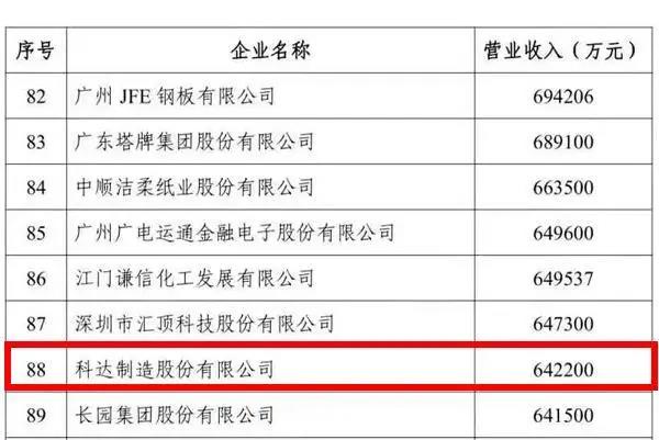 11月26日,由廣東省制造業(yè)協(xié)會、廣東省發(fā)展和改革研究院、暨南大學(xué)產(chǎn)業(yè)經(jīng)濟(jì)研究院主辦的“2020廣東省制造業(yè)發(fā)展年會暨廣東省制造業(yè)500強(qiáng)企業(yè)峰會”在中山舉行,會上發(fā)布了《2020年廣東省制造業(yè)500強(qiáng)企業(yè)榜單》,華為、正威國際、富士康位列廣東制造業(yè)企業(yè)500強(qiáng)前三位。科達(dá)制造繼續(xù)強(qiáng)勢進(jìn)榜,位居榜單的第88位。