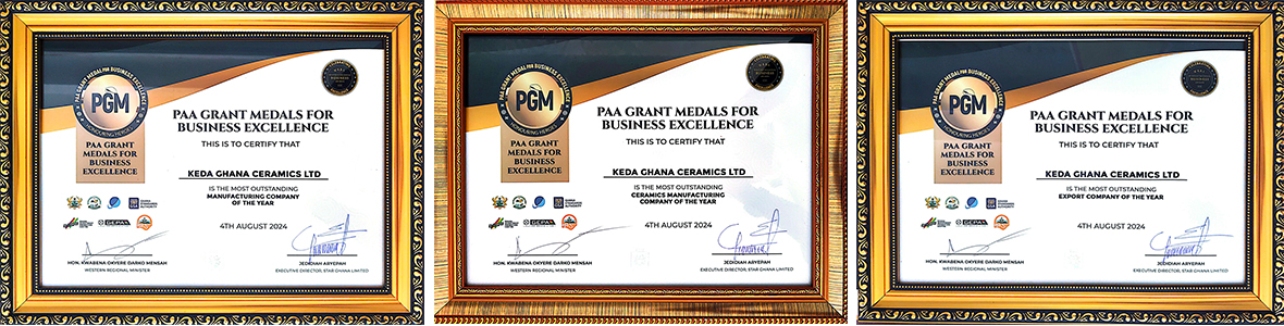 在近日舉行的加納西部省商業(yè)頒獎(jiǎng)典禮(Paa Grant Medals for Business Excellence)上,特福加納陶瓷公司榮獲“2024年度最佳制造業(yè)企業(yè)獎(jiǎng)”、“2024年度最佳陶瓷制造業(yè)企業(yè)獎(jiǎng)”和“2024年度出口成就獎(jiǎng)”三項(xiàng)大獎(jiǎng)。該獎(jiǎng)項(xiàng)旨在表彰在報(bào)告年度內(nèi)對(duì)當(dāng)?shù)亟?jīng)濟(jì)產(chǎn)生積極影響的企業(yè)。