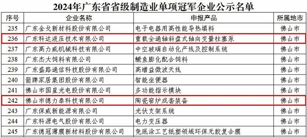 近日,廣東省工業(yè)和信息化廳公示2024年省級制造業(yè)單項冠軍企業(yè)通過名單,本次全省共有357家企業(yè)通過遴選認定。科達制造子公司德力泰及科達液壓通過遴選榮登榜單。