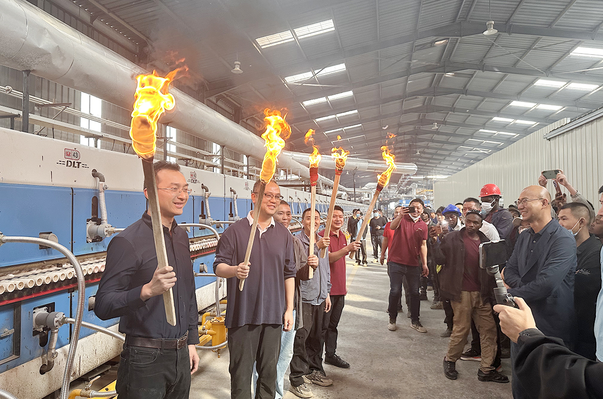 隨后,在眾人的期待中,點火環(huán)節(jié)正式開始。單瓅副總經(jīng)理、傅偉廠長與員工代表共同手持火炬,緩緩走向窯爐。當(dāng)火炬接觸到窯爐、火焰迅速燃起的瞬間,現(xiàn)場爆發(fā)出來自中外員工的熱烈掌聲與歡呼聲,喜迎這一生產(chǎn)線正式投產(chǎn)。