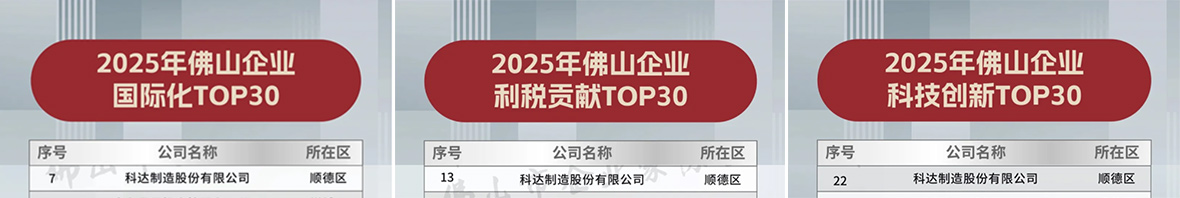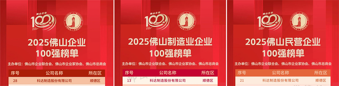 科達(dá)制造第七度入圍“佛山企業(yè)100強(qiáng)”榜單,排名大幅躍升,從2024年的第39位躍至第28位。同時(shí),科達(dá)制造還上榜“制造業(yè)企業(yè)100強(qiáng)”、“民營(yíng)企業(yè)100強(qiáng)”、“國(guó)際化TOP30”、“利稅貢獻(xiàn)TOP30”、“科技創(chuàng)新TOP30”的全部榜單。其中,在“民營(yíng)企業(yè)100強(qiáng)”中排名第21位,“制造業(yè)企業(yè)100強(qiáng)”中位列第13位,排名均顯著提升,“國(guó)際化TOP30”“利稅貢獻(xiàn)TOP30”“科技創(chuàng)新TOP30”分別位列第7、13、22名。