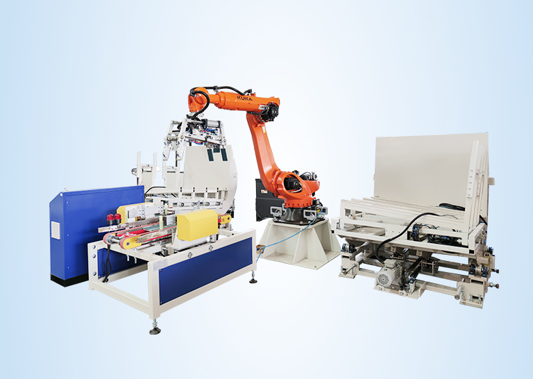 集成機(jī)器人,通過夾具將轉(zhuǎn)包按照一定秩序堆放在磚架上,由叉車轉(zhuǎn)運(yùn)入倉;也可通過翻托裝置將磚架上 的磚垛轉(zhuǎn)移到木托上,再由叉車轉(zhuǎn)運(yùn)入倉。如需要在圍碼時實現(xiàn)轉(zhuǎn)包和包裝紙全部朝外、且噴碼面(或蓋 章面)統(tǒng)一朝外的出口托要求,則需要配獨(dú)立的轉(zhuǎn)臺和翻包機(jī)。