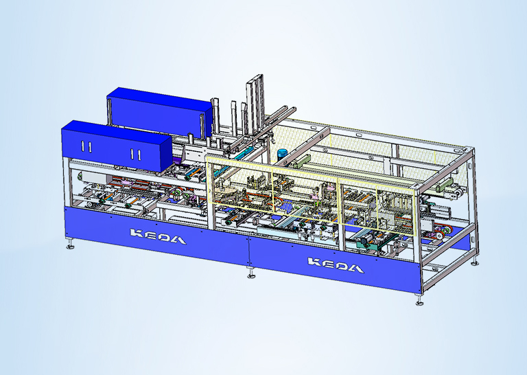 本設備為磚垛套紙箱、折成磚包及封膠帶。采用刮出式取紙、伸入式撐箱、推進式裝箱以及動態(tài)折紙封箱的多工位流水線式包裝動作,推磚和撐箱等關鍵工位均采用伺服電機控制,定位精準,動作穩(wěn)定,包裝美觀。