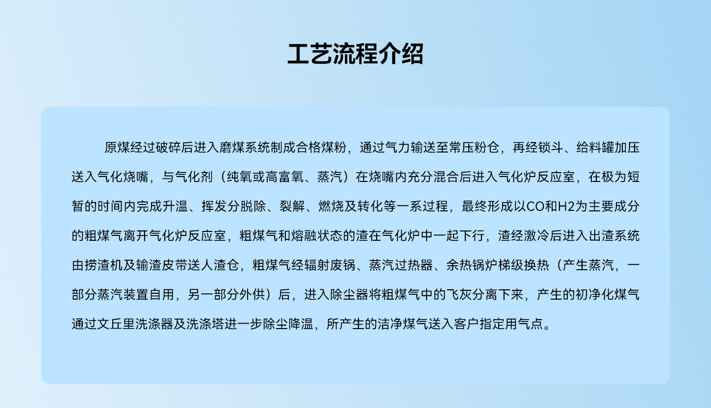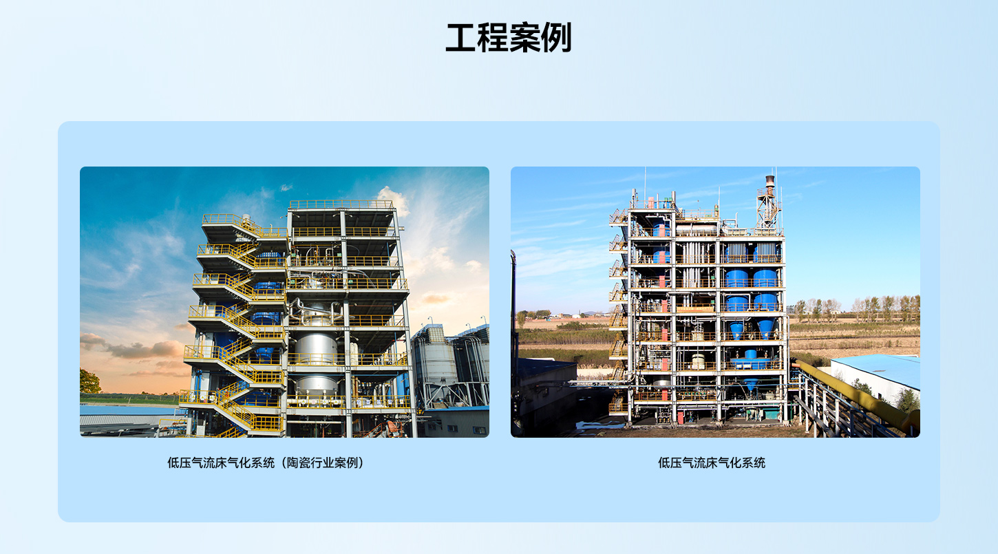 采用空氣氣化和富氧氣化,為有色冶金、建材、焦化等行業(yè)提供燃料氣,也可為合成氨、甲醇、煤制氫等行業(yè)提供原料氣。