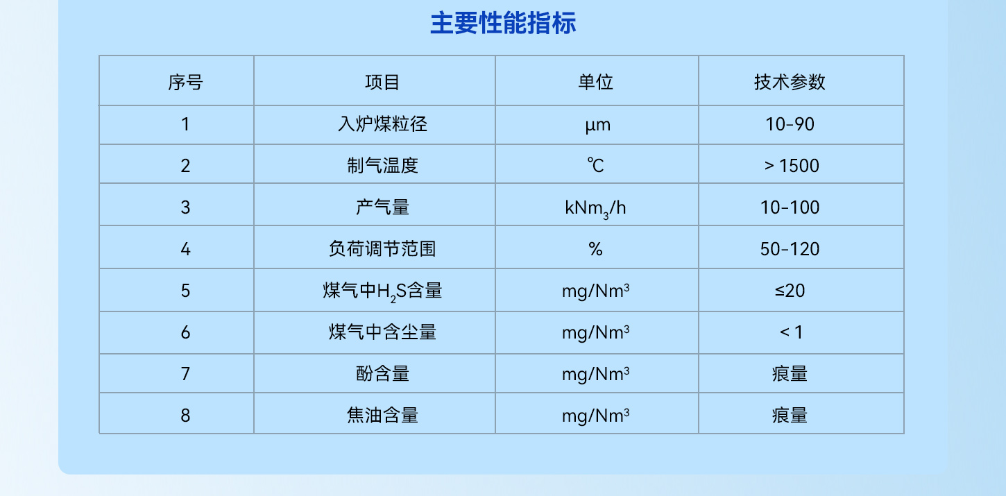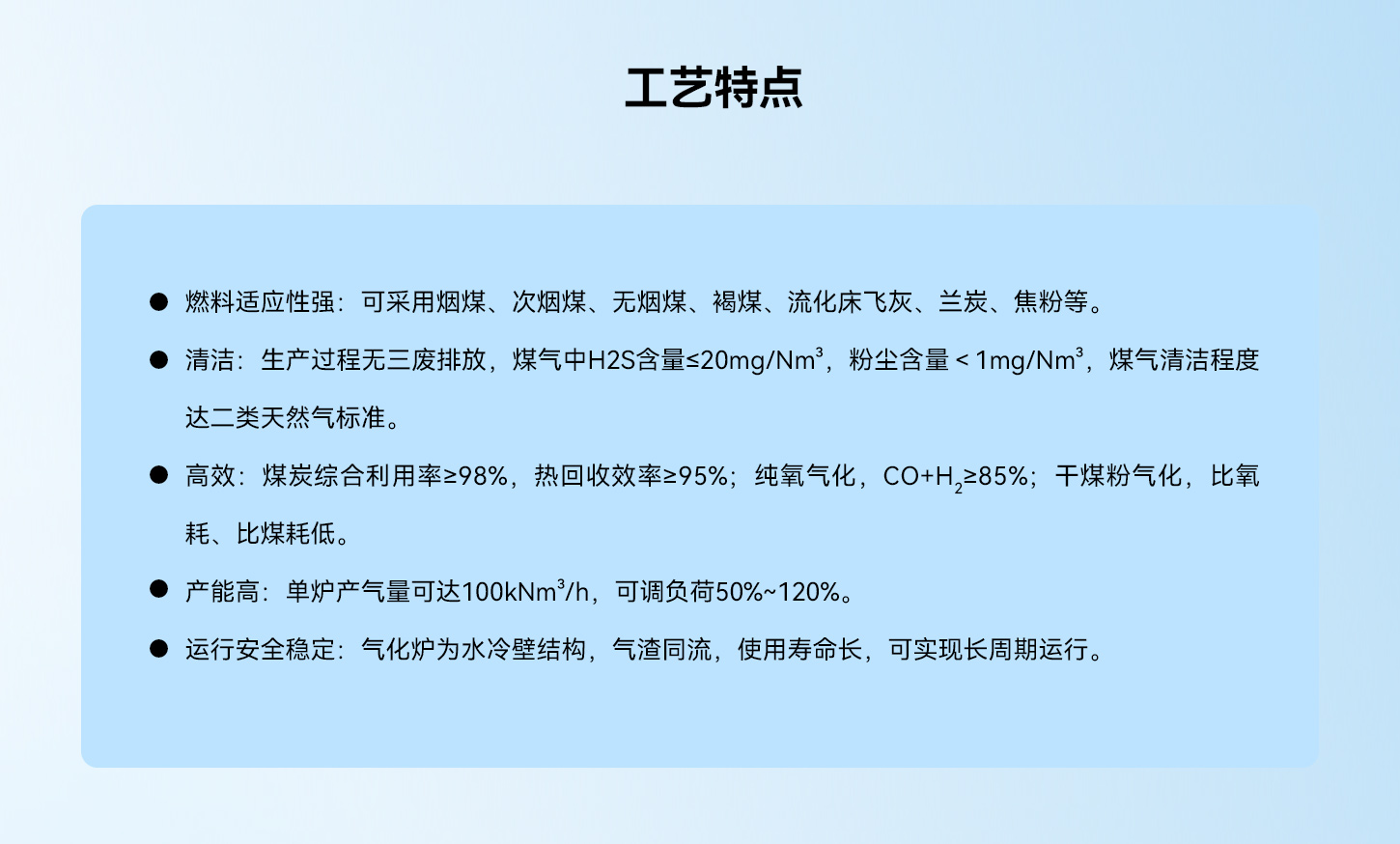 ● 清潔:生產過程無三廢排放,煤氣中H2S含量≤20mg/Nm3,粉塵含量≤10mg/Nm3,煤 氣清潔程度達二類天然氣標準。