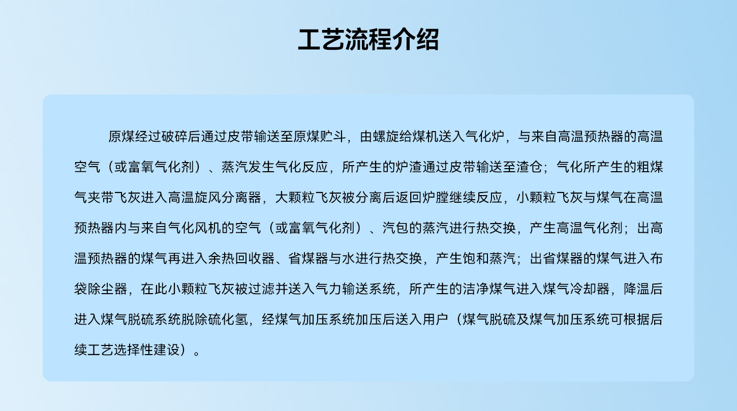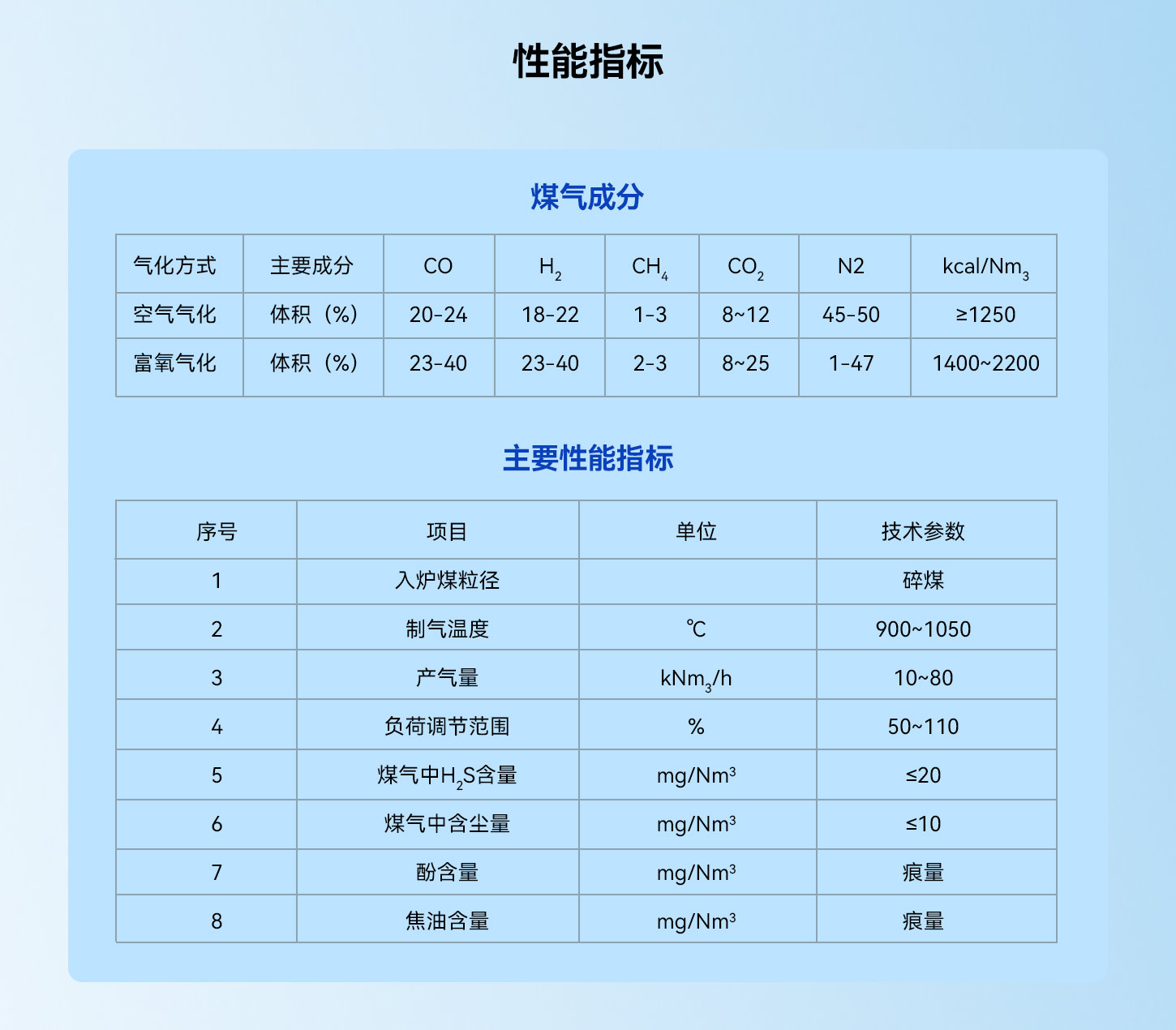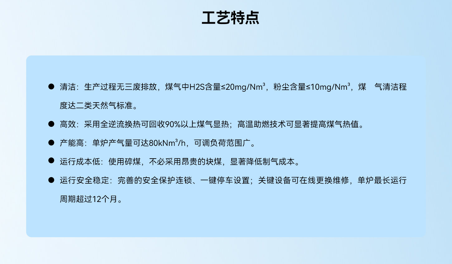 ● 清潔:生產(chǎn)過(guò)程無(wú)三廢排放,煤氣中H2S含量≤20mg/Nm3,粉塵含量≤10mg/Nm3,煤 氣清潔程度達(dá)二類天然氣標(biāo)準(zhǔn)。 ● 高效:采用全逆流換熱可回收90%以上煤氣顯熱;高溫助燃技術(shù)可顯著提高煤氣熱值。 ● 產(chǎn)能高:?jiǎn)螤t產(chǎn)氣量可達(dá)80kNm3/h,可調(diào)負(fù)荷范圍廣。 ● 運(yùn)行成本低:使用碎煤,不必采用昂貴的塊煤,顯著降低制氣成本。 ● 運(yùn)行安全穩(wěn)定:完善的安全保護(hù)連鎖、一鍵停車設(shè)置;關(guān)鍵設(shè)備可在線更換維修,單爐最長(zhǎng)運(yùn)行周期超過(guò)12個(gè)月。