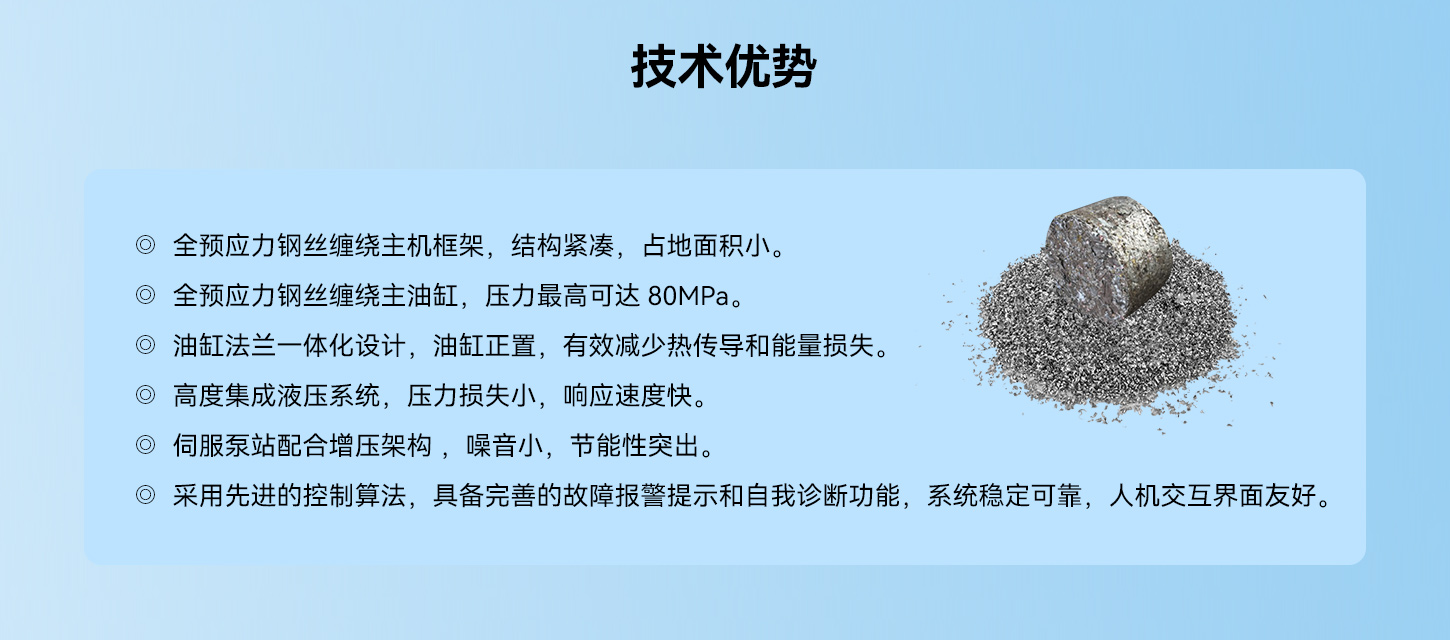 ◎ 全預(yù)應(yīng)力鋼絲纏繞主機框架,結(jié)構(gòu)緊湊,占地面積小。 ◎ 全預(yù)應(yīng)力鋼絲纏繞主油缸,壓力最高可達 80MPa。 ◎ 油缸法蘭一體化設(shè)計,油缸正置,有效減少熱傳導(dǎo)和能量損失。 ◎ 高度集成液壓系統(tǒng),壓力損失小,響應(yīng)速度快。 ◎ 伺服泵站配合增壓架構(gòu) ,噪音小,節(jié)能性突出。 ◎ 采用先進的控制算法,具備完善的故障報警提示和自我診斷功能,系統(tǒng)穩(wěn)定可靠,人機交互界面友好。