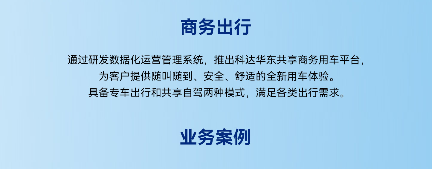 通過研發(fā)數(shù)據(jù)化運(yùn)營(yíng)管理系統(tǒng),推出科達(dá)華東共享商務(wù)用車平臺(tái),為客戶提供隨叫隨到、安全、舒適的全新用車體驗(yàn)。具備專車出行和共享自駕兩種模式,滿足各類出行需求。